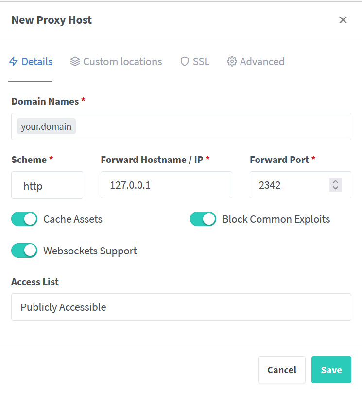 # HTTPS reverse proxy such as Traefik or Caddy. Your files and passwords will otherwise be transmitted